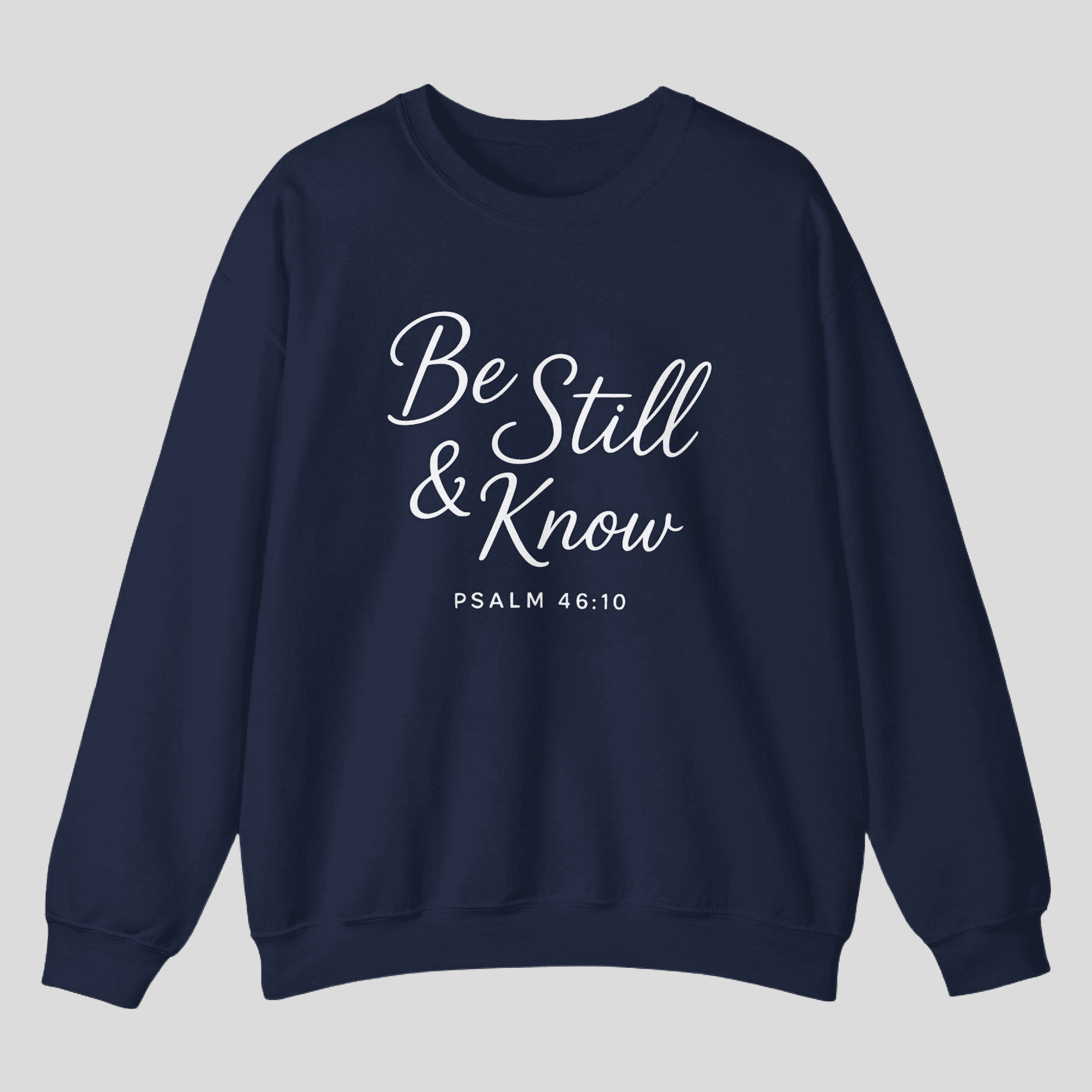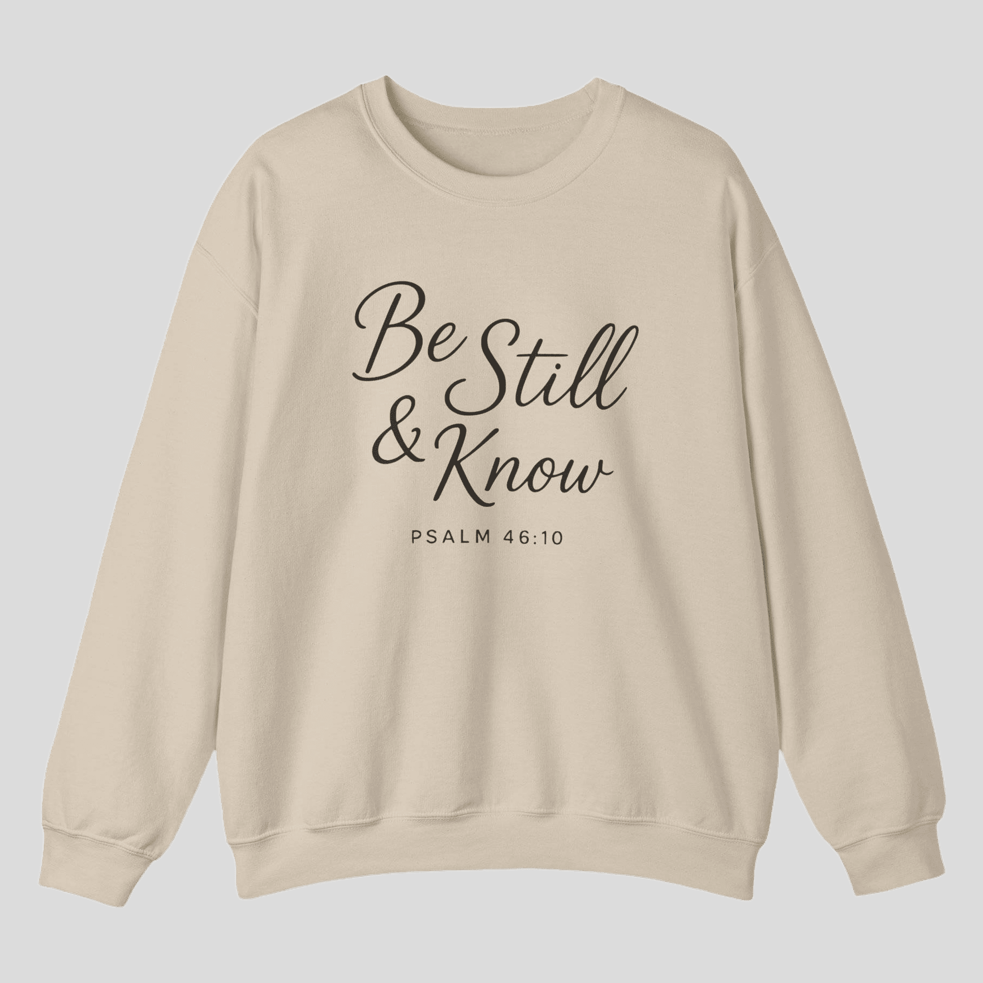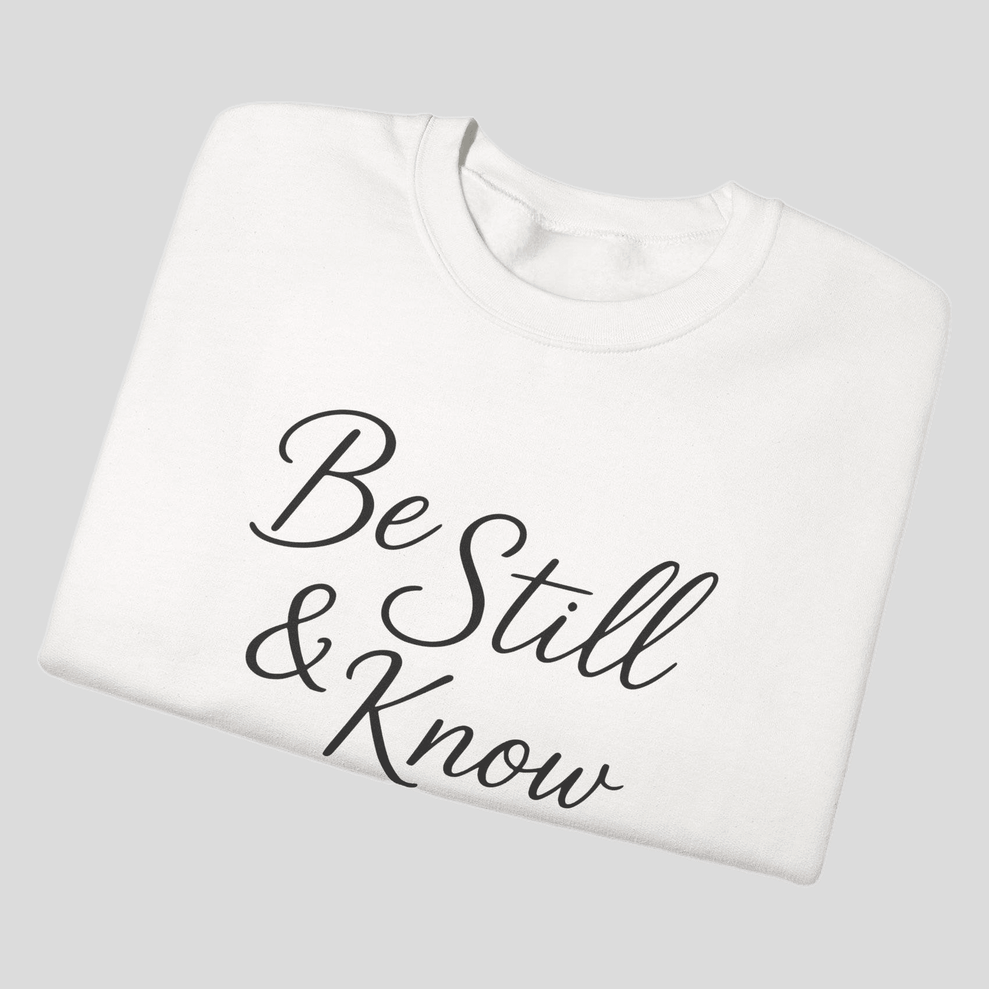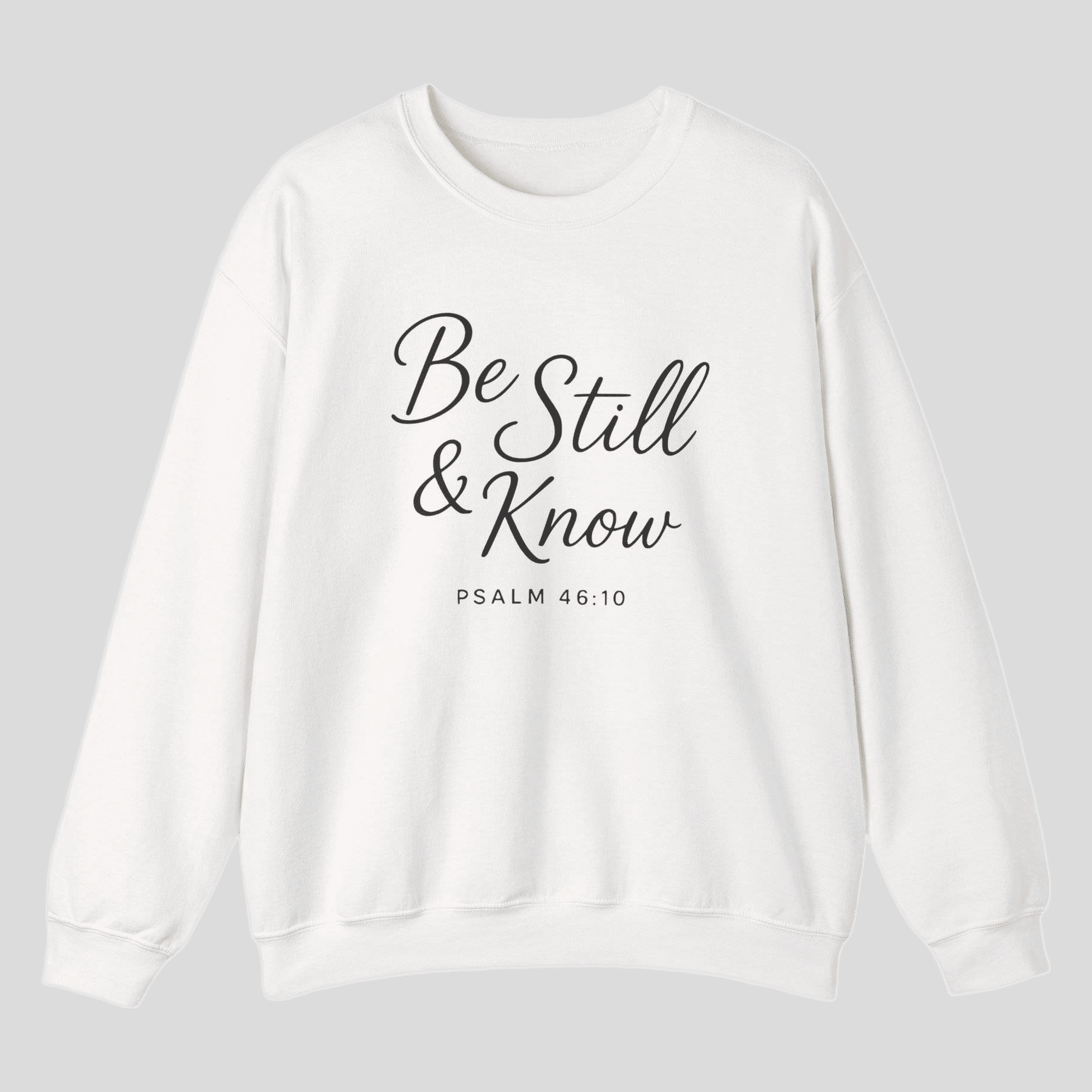 A faith-filled Gildan crewneck featuring Be Still and Know from Psalm 46:10. Minimal, comfortable, and purpose-driven—wear your reminder to trust God daily.